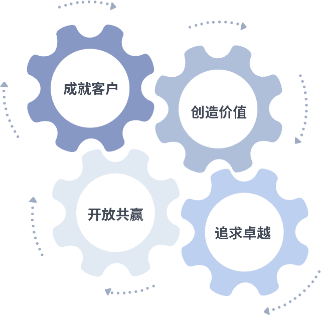 成就客户是一切决策的出发点,,,,创造价值是衡量所有工作的标准,,,追求卓越是我们做事做人的态度,,,开放共赢是我们的格局也是最终的结果。。。。价值观的齿轮环环相扣,,,推动着组织里的每个人不断向前。。。。